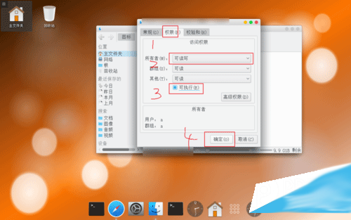 2、在菜单里面则点击权限,所有者选择可读写,在数字3这里选择可执行,然后点击确定。