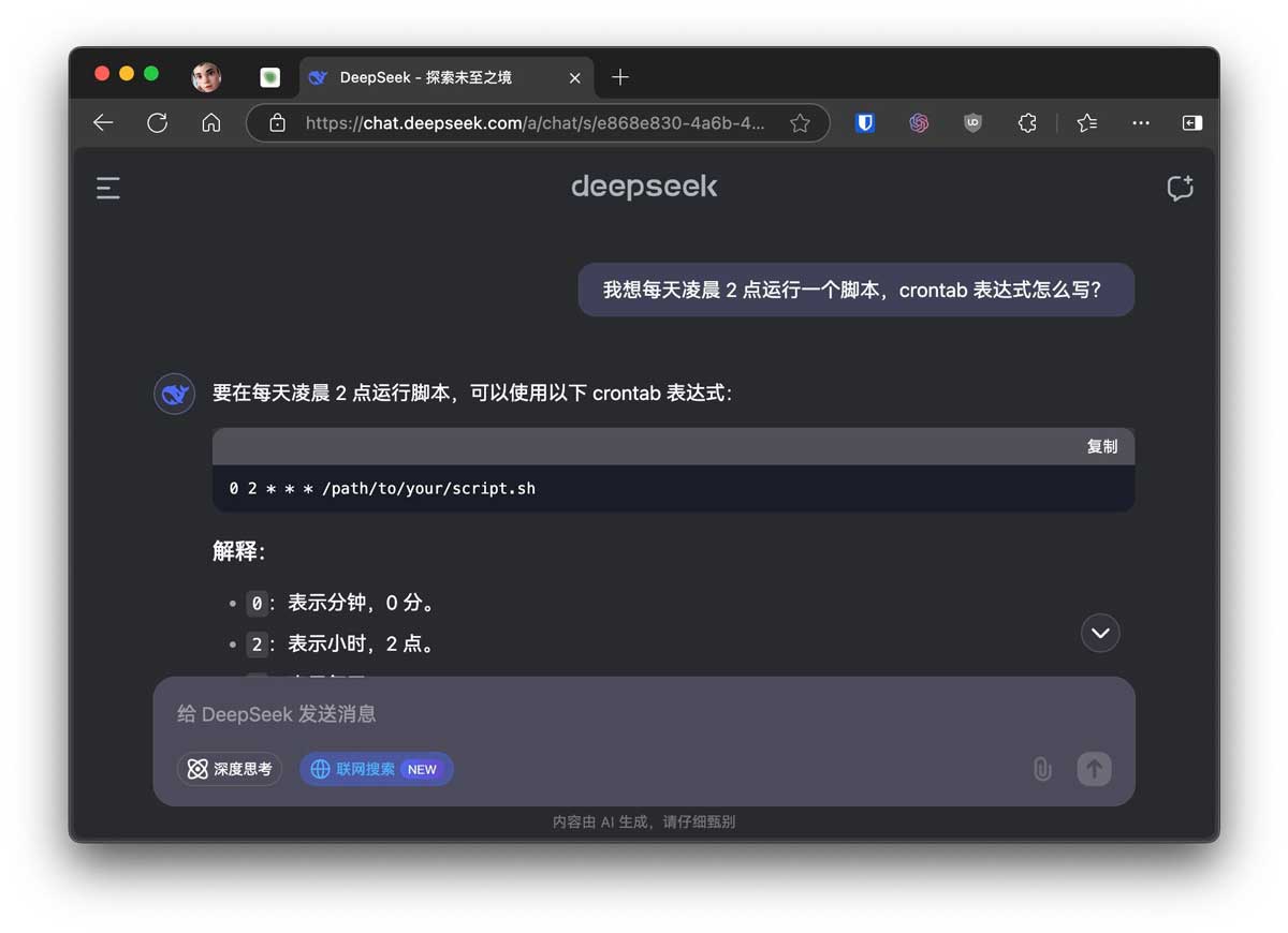 - 现在嘛,直接找 AI 帮忙就完事了!比如找 ChatGPT、DeepSeek,只要说出你的需求,AI 就能帮你生成对应的表达式。举个例子,你可以直接问:「我想每天凌晨 2 点运行一个脚本,crontab 表达式怎么写?」是不是方便多了?