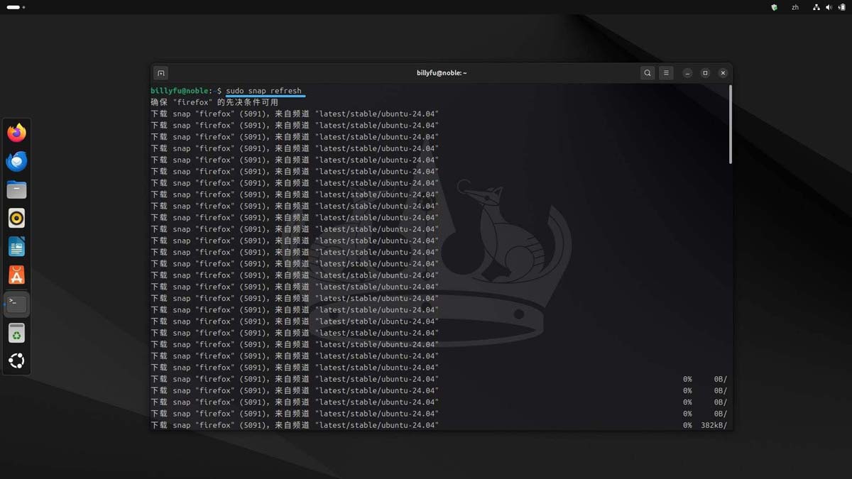 虽然 Snap 软件包通常会自动更新,但你也可以手动触发更新: