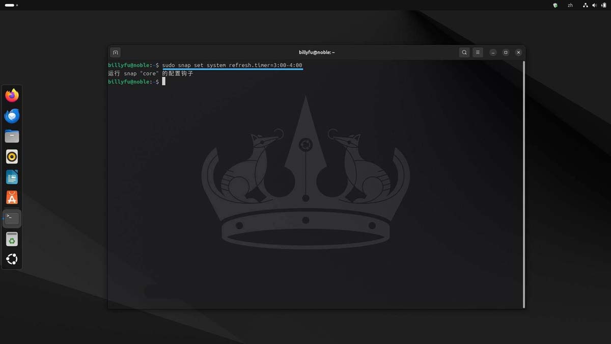 默认情况下,Snap 软件包会每天自动更新 4 次。我们可以设置刷新计时器,调整自动更新的时间段。例如,将更新安排在夜间时段: