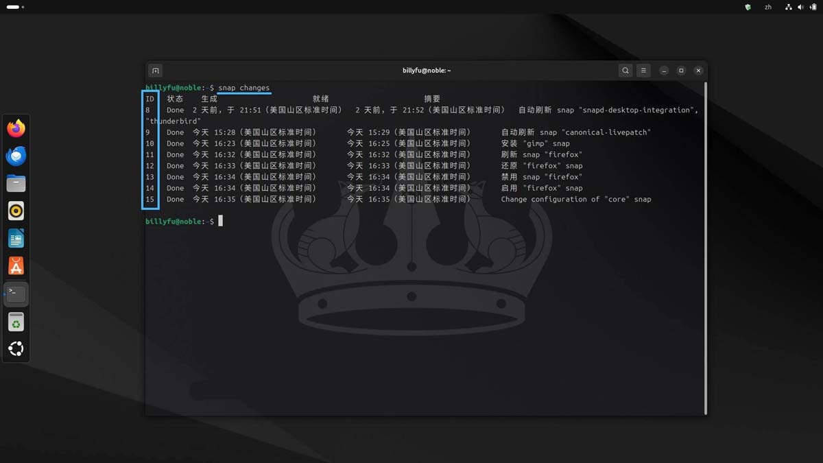 使用以下命令,查看系统上 Snap 的所有更改记录,包括安装、更新、删除或回滚等操作: