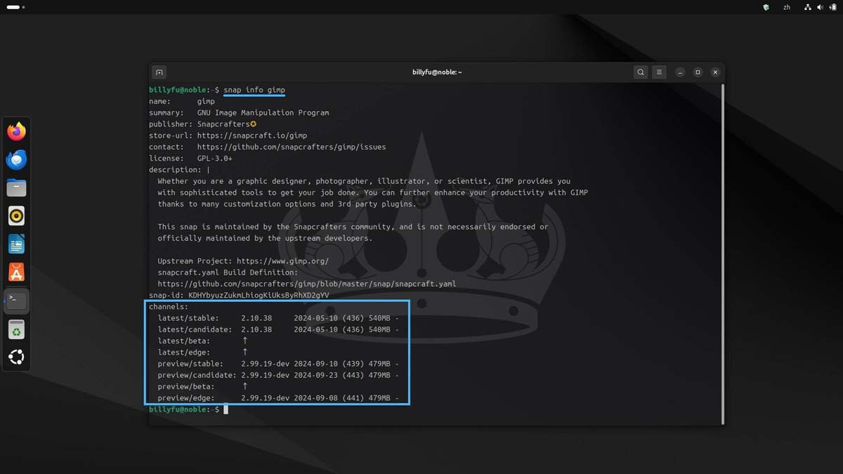 可以使用以下命令,查看 Snap 软件包的详细信息,包括版本、描述、发布者和渠道等:
