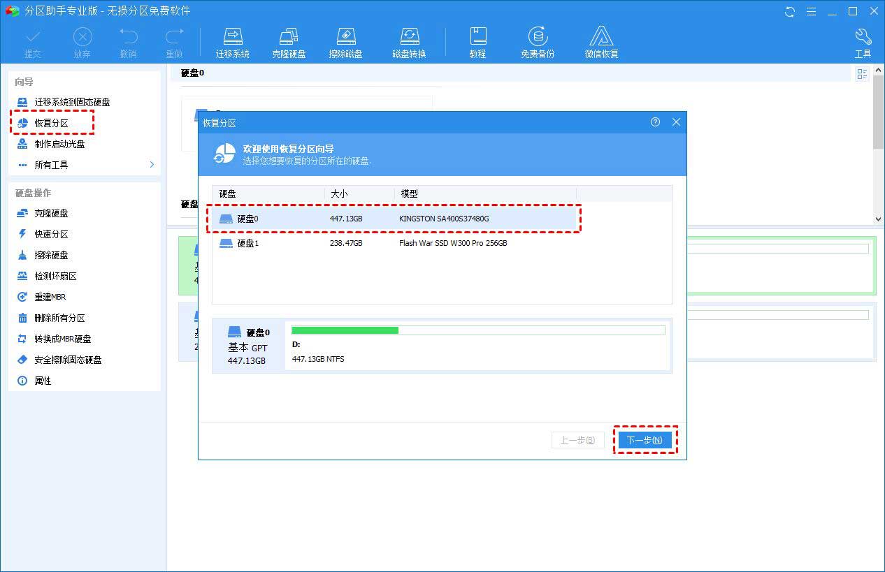 1. 运行傲梅分区助手,单击左侧向导中的“恢复分区”,在弹出的窗口中选择被删除的分区的硬盘,再单击“下一步”。