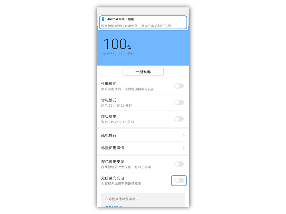 1. 在 设置 > 电池 选项菜单内,打开无线反向充电的功能开关,如下图所示: