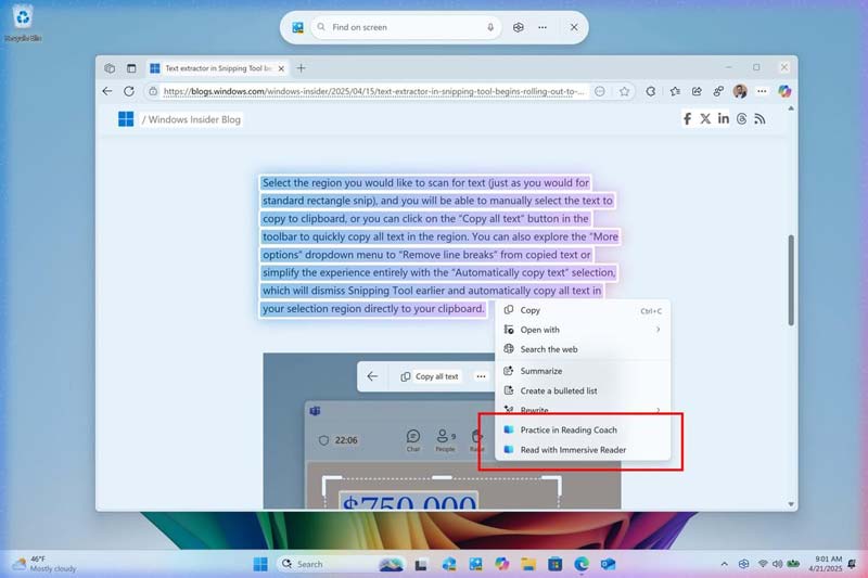 微软针对 Windows 11 AI+ PC 设备,为 Click to Do 功能新增“Practice in Reading Coach”和“Read with Immersive Reader”两项文本操作选项。