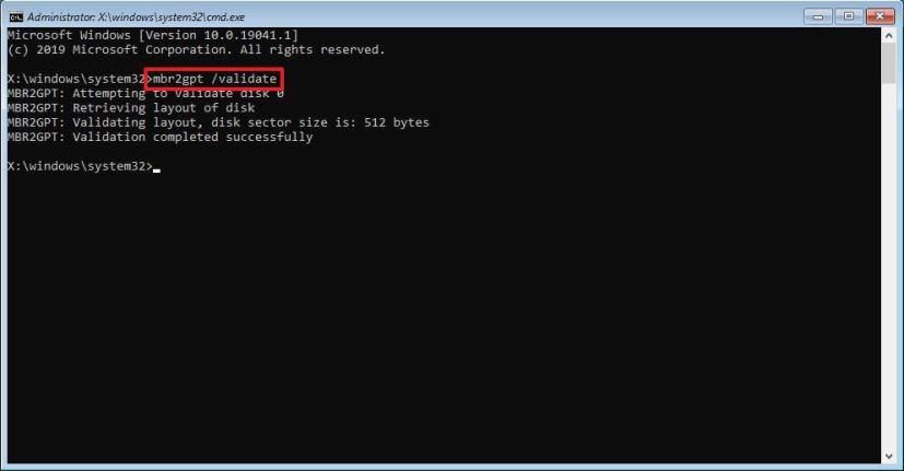 9. 输入“mbr2gpt /validate”,并按回车键,该命令主要验证磁盘。