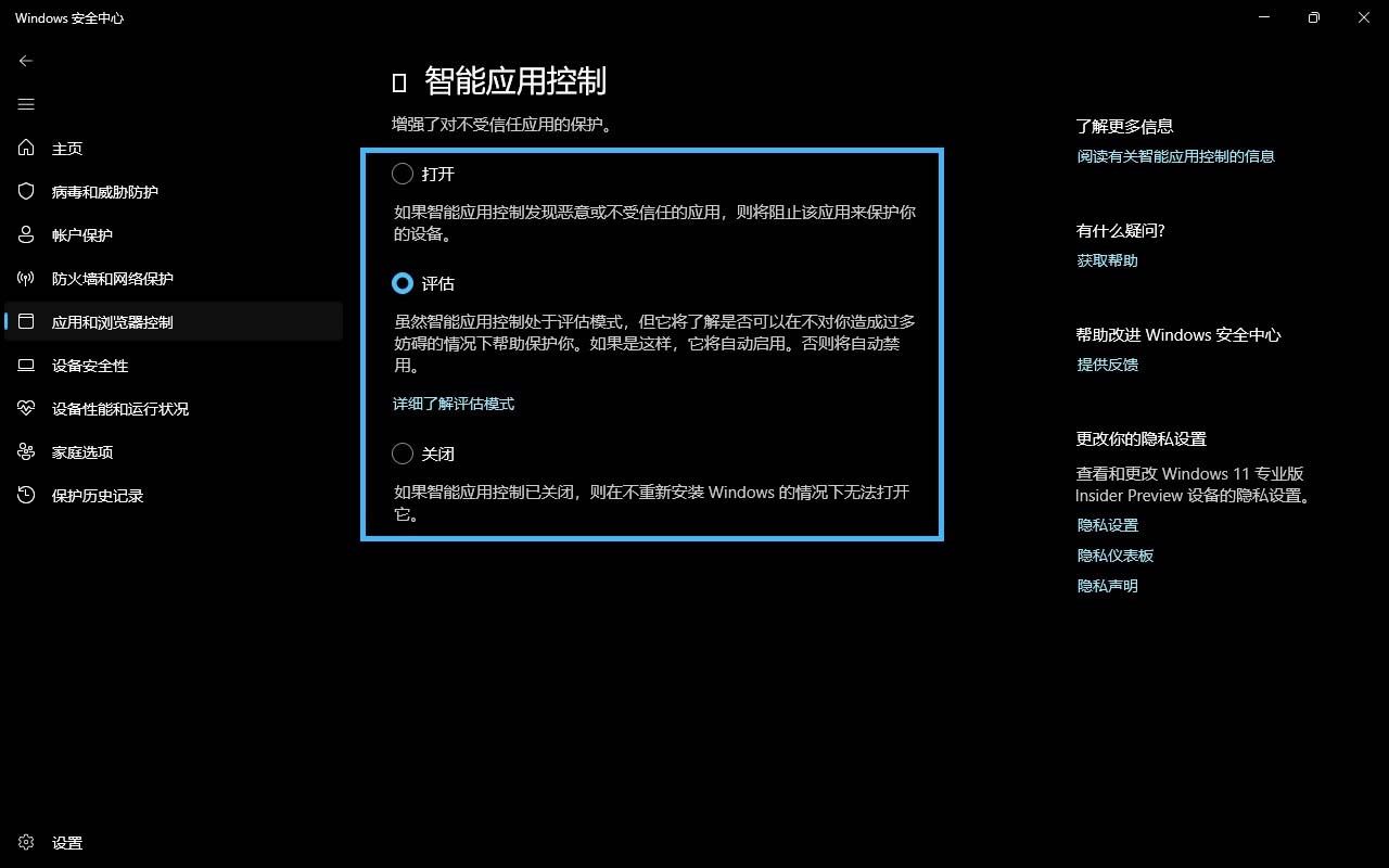 对于大多数用户来说,「智能应用控制」都可以正常运行,也不会造成太多干扰。如果你拿捏不准要不要启用,可以选择「评估」模式,让 Windows 11 根据你的使用情况自动决定最合适的设置。如果它对你的日常使用造成了过多干扰,也可以随时在「Windows 安全中心」手动关闭。