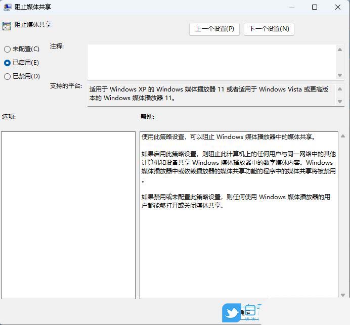 4、阻止媒体共享窗口中,将其设置更改选择为已启用选项,然后点击确定即可;