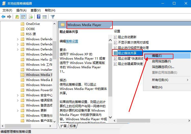 3、然后,在 Windows Media Player 选项右侧窗口中,找到并右键点击阻止媒体共享,在打开的菜单项中,选择编辑选项命令;