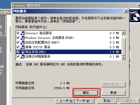 步骤2、选取“域名系统(DNS)”组件后单击“确定”按钮。