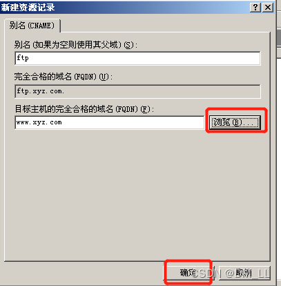步骤2 然后在出现的对话框输入别名ftp,在“目标主机的完全合格的域名”文本框输入该别名指向的主机完全域名名称。如www.xyz.com。