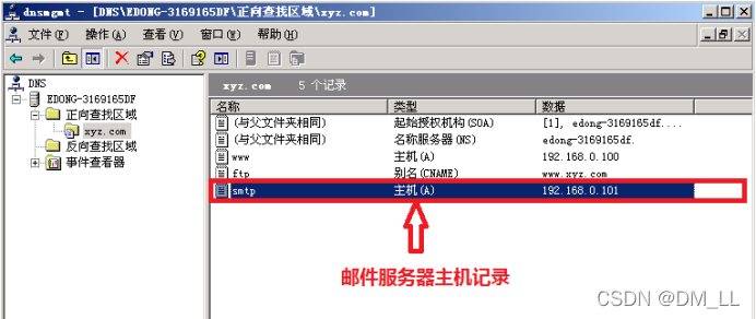 步骤1 要建立邮件交换器,先要建立邮件服务器的主机录。右击xyz.com区域并选择“新建主机”。