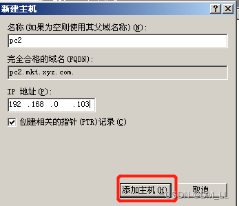 步骤2 在子域内输入pc2的主机资源记录。右击子域mkt,然后选择“新建主机”。