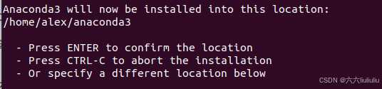 CTRL-C键:中止安装过程。 - 指定其他路径:如果需要将 Anaconda3 安装到其他目录,可以手动输入新的路径。