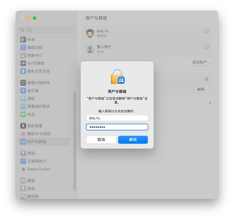 3、验证管理员账户的密码——点击「解锁」按钮——再验证选定账户的密码,点击「好」按钮确认。