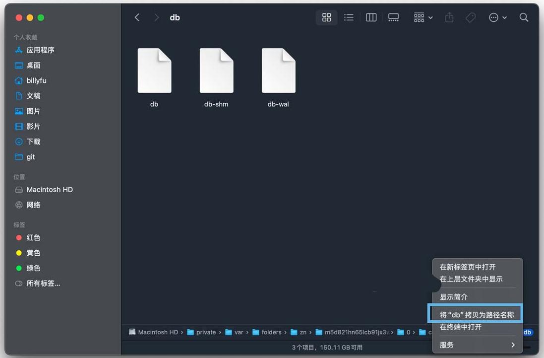 4、先显示「访达」路径栏,然后复制db文件夹的路径。