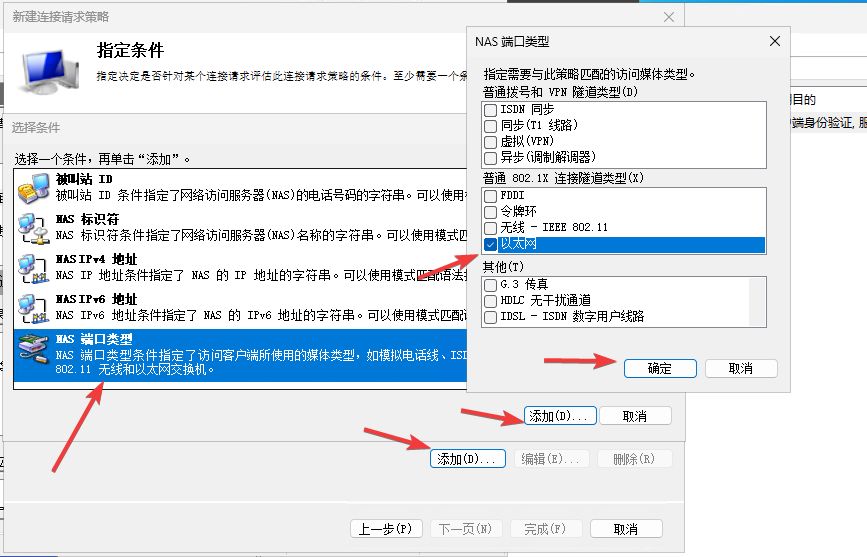 添加条件 - 选择 NAS端口类型 - 选择 以太网(有线) - 确认添加 - 下一页