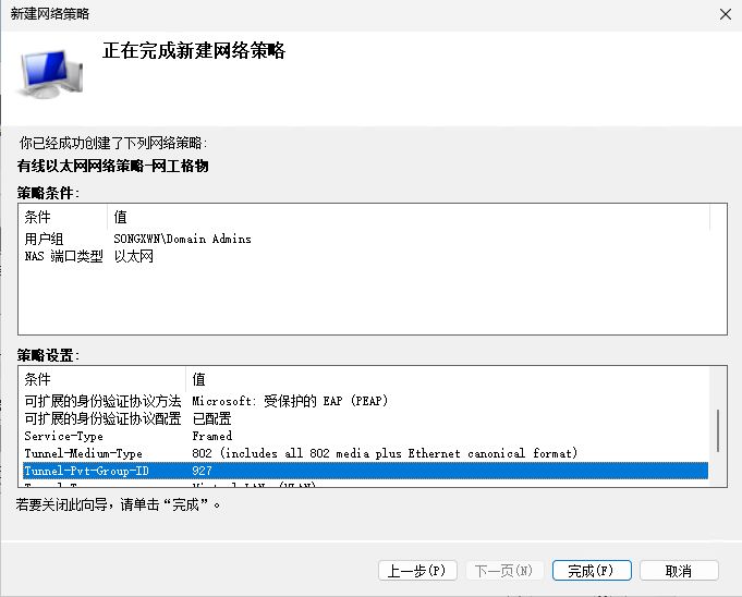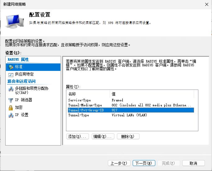 修改Radius属性 - 标准,全部和上面的一致,就可以分配对应用户组的指定接入VLAN - 继续下一页