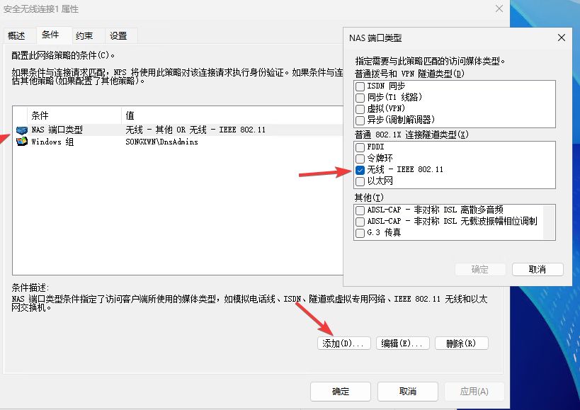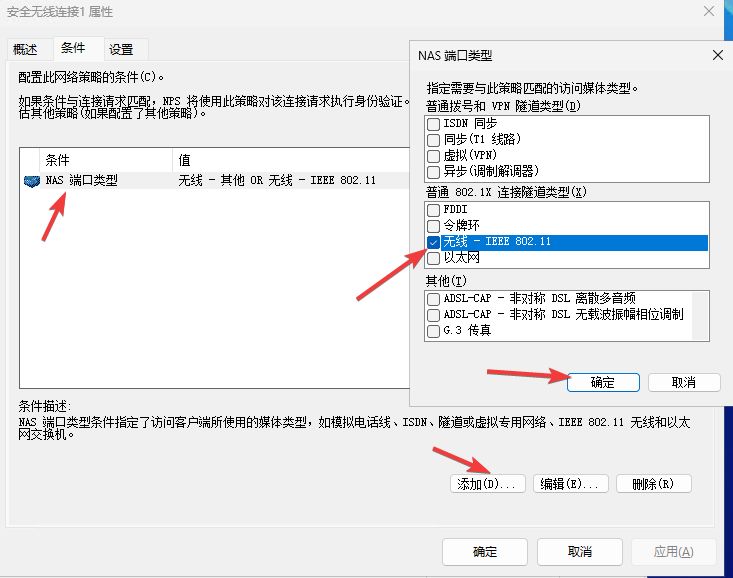 其他步骤与有线策略已有,只需要把条件 NAS端口类型改为 无线 - IEEE 802.11