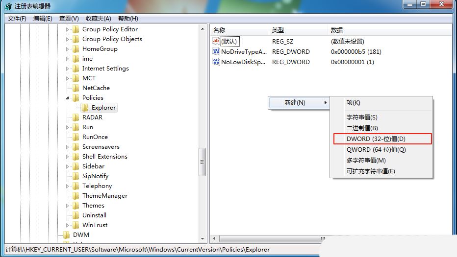 2、接着,依次点击打开“计算机HKEY_CURRENT_USER\SOFTWARE\Microsoft\Windows\CurrentVersion\Policies\Explorer”。