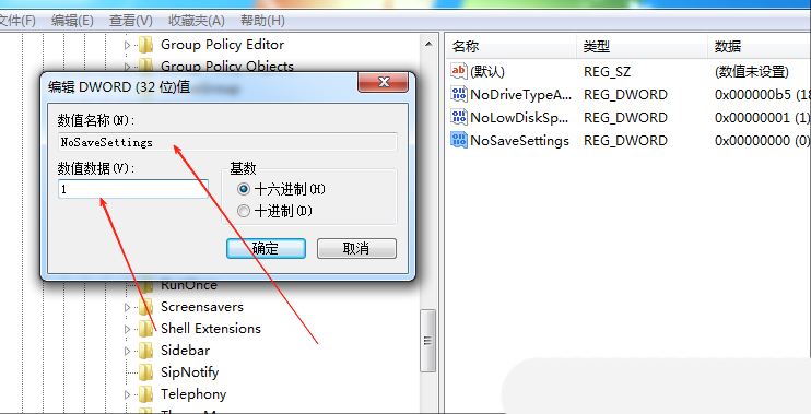 4、随后,将新建的值命名为“NoSaveSettings”,并设置其“数值数据”值为1,点击确定即可。