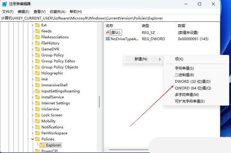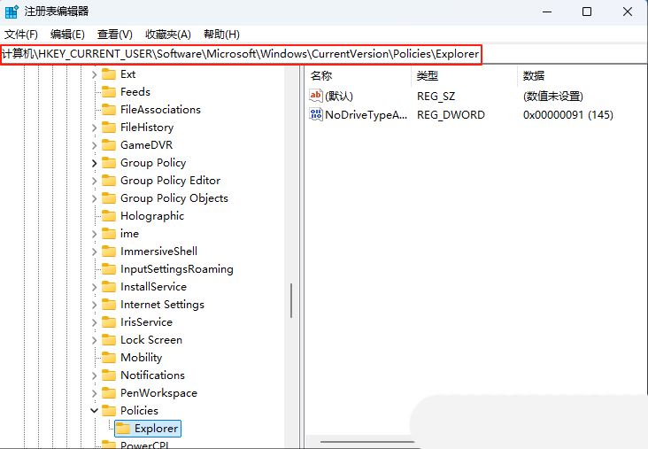 2、接着,依次点击打开“计算机HKEY_CURRENT_USER\SOFTWARE\Microsoft\Windows\CurrentVersion\Policies\Explorer”。