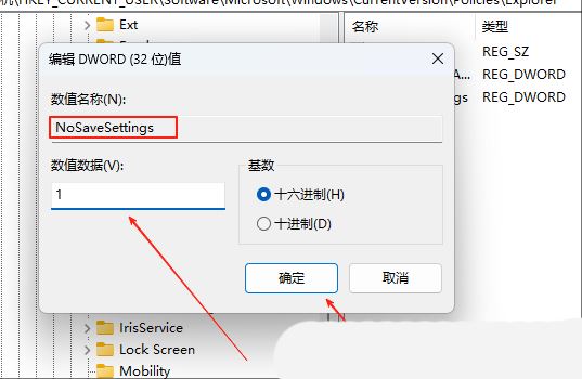 4、随后,将新建的值命名为“NoSaveSettings”,并设置“数值数据”值为1,点击确定即可。