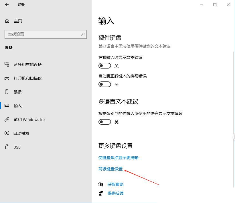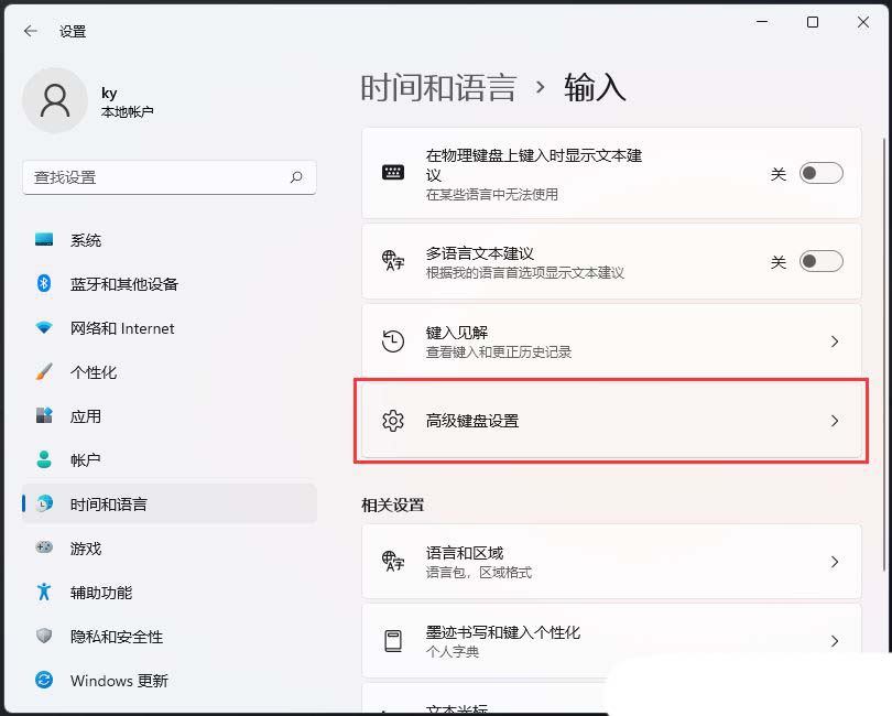 4、当前路径为:时间和语言 > 输入,点击【高级键盘设置】;