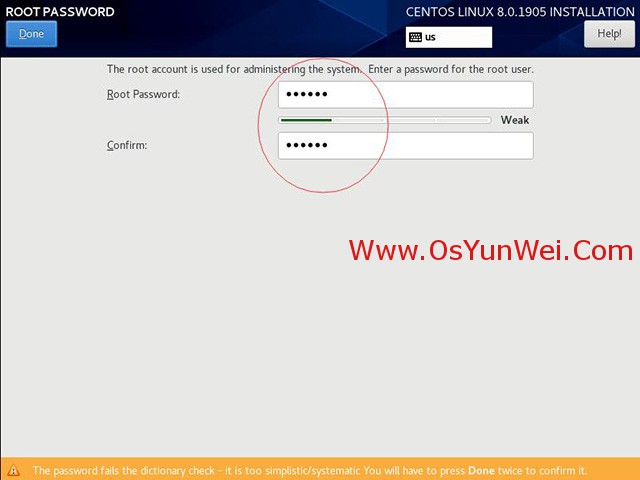 如果密码长度太短会出现提示,设置好后要确认两次,安装继续。