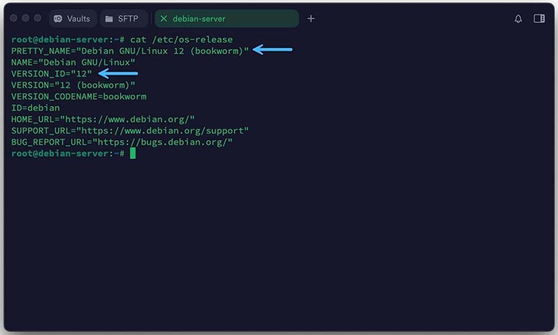 /etc/os-release文件就像是 Linux 系统的「身份证」,记录着操作系统的基本信息。里面包含了 Debian 的版本号等重要内容。你只需在「终端」中执行以下命令,就能快速查看: