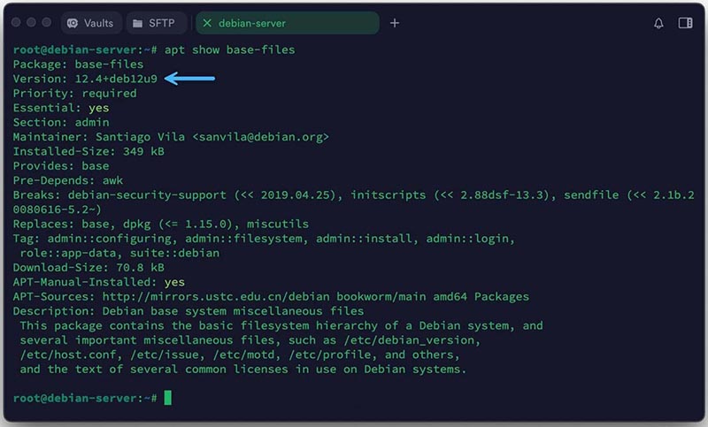 如果你对 Debian 的 APT 包管理工具比较熟悉,可以通过检查base-files软件包的版本,来快速确定系统版本:
