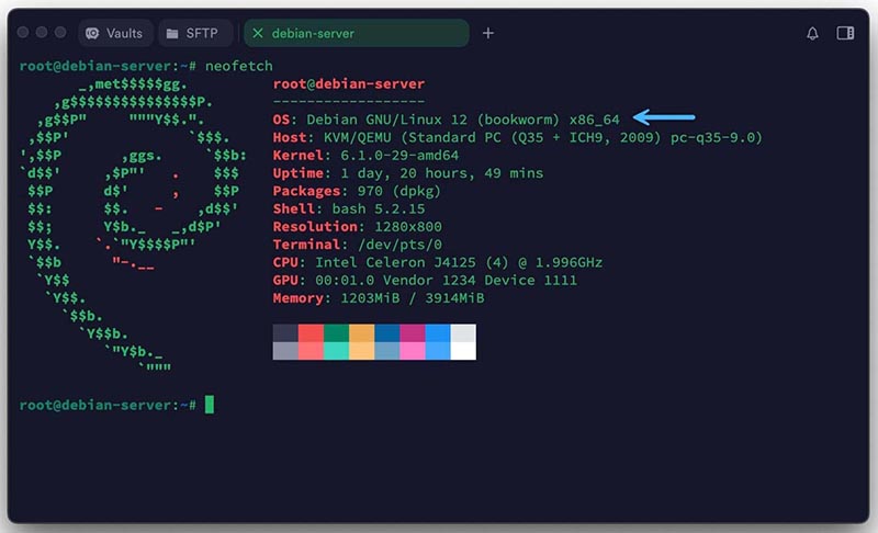 如果你想以更酷炫的方式来查看系统信息,可以试试 Neofetch 工具。它不仅能显示 Debian 的版本,还能以图形化的方式展示完整的系统信息,甚至附带发行版的 Logo,绝对是颜值与实力并存的选择。