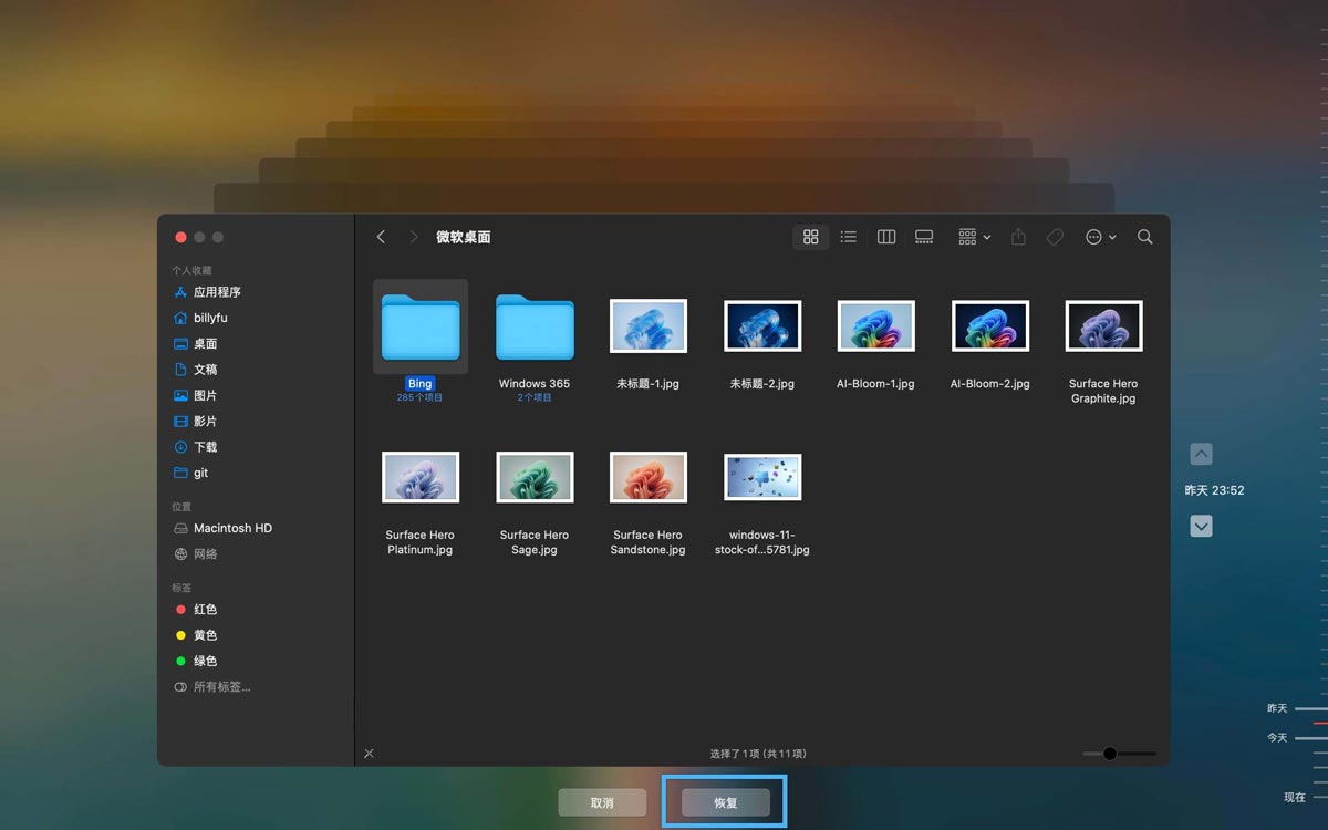 2、浏览历史备份:进入后,你会看到一个熟悉的「访达」窗口,但右边多了一个时间轴,来显示所有备份记录(最新的在最下面)。你可以: