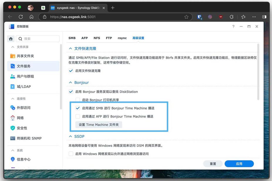 - 启用通过 SMB 进行 Bonjour Time Machine 播送