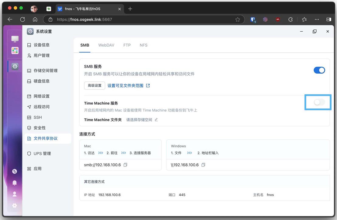 在飞牛 OS 的「系统设置」>「文件共享协议」>「SMB」配置中,你可以: