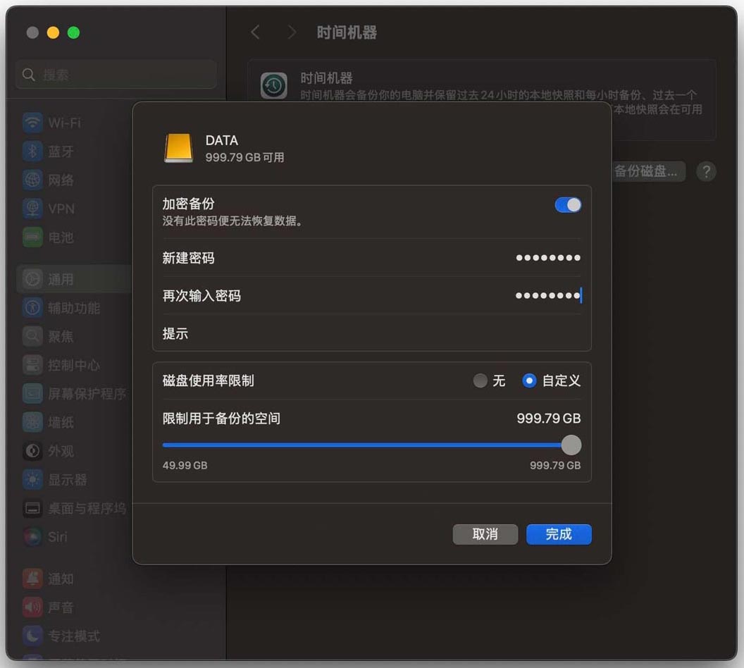 - 你也可以打开「磁盘使用率限制」,控制备份占用的最大空间,这样硬盘的剩余空间还能用来存储其他文件。