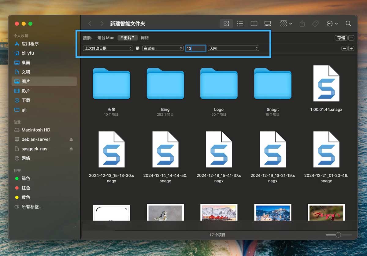 「智能文件夹」是一个动态筛选工具,它会根据你设定的规则,来自动更新文件夹内容。比如,你可以创建一个智能文件夹,专门显示「最近 10 天修改过的所有文件」,这样一来,追踪项目进展就轻松多了,再也不用手动整理文件。