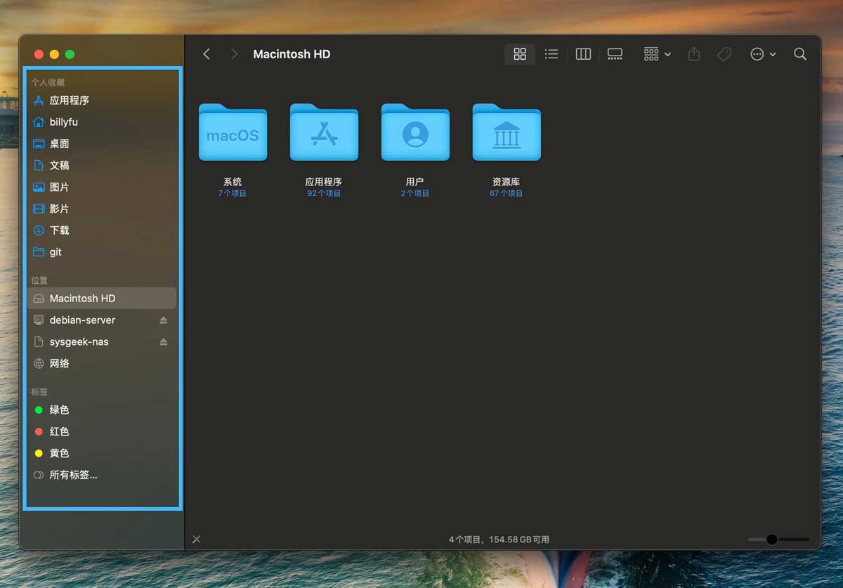 「侧边栏」绝对是「访达」中的导航利器。你可以在这里添加常用文件夹、智能文件夹和搜索结果,还能放入网络共享位置。比如说,把常用的共享驱动器固定在「侧边栏」,就能实现快速切换,大大提升访问效率。
