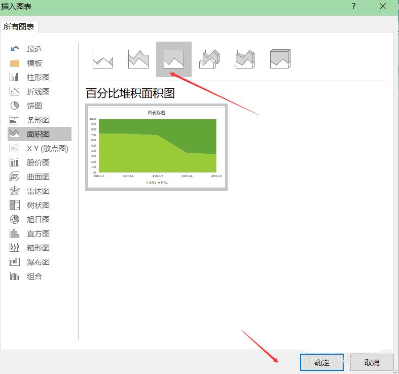 在【插入图表】的【面积图】分类中选择【百分比堆积面积图】