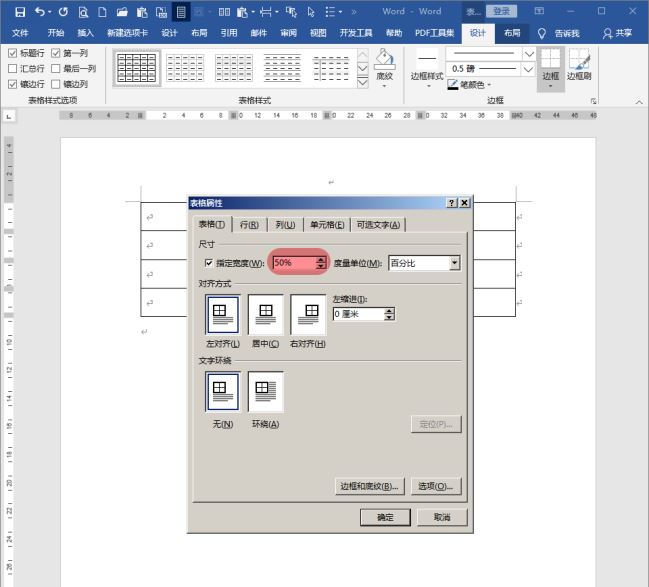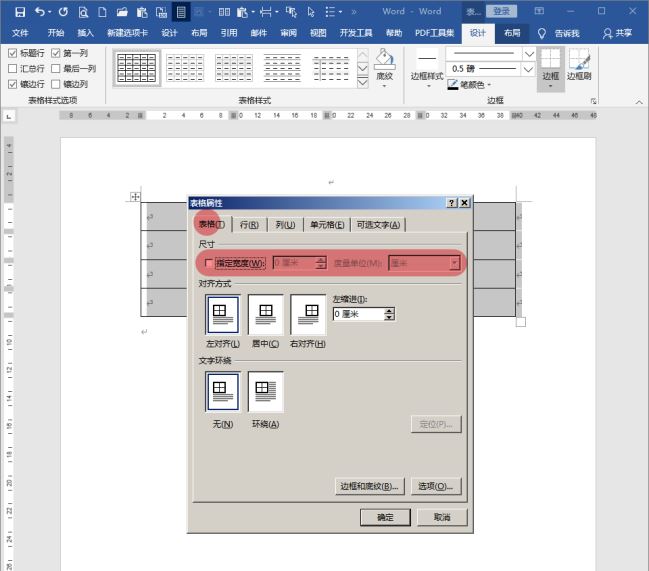 在打开的【表格属性】设置窗口中,切换到【表格】选项卡,看尺寸设置项。