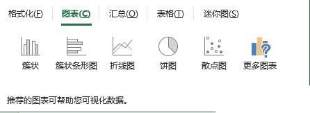 在【快速分析】中,提供了柱状图、饼状图、条形图、折线图、散点图等五种图表供我们快速使用,更多图表则需要点击进入二级菜单。