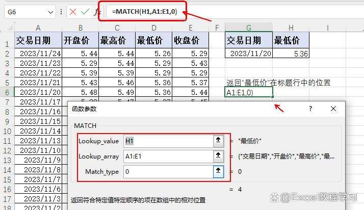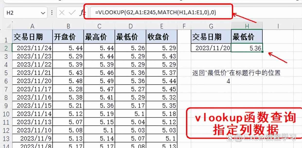 这里我们要查询日期为“2023/11/20”的最低价,如果使用vlookup函数来查询,其关键一步是要确定要返回的结果位于区域中的第几列,当数据量不大时,可以直接数出结果列的位置,但这里我们将使用match函数来快速返回要返回结果的列序号。