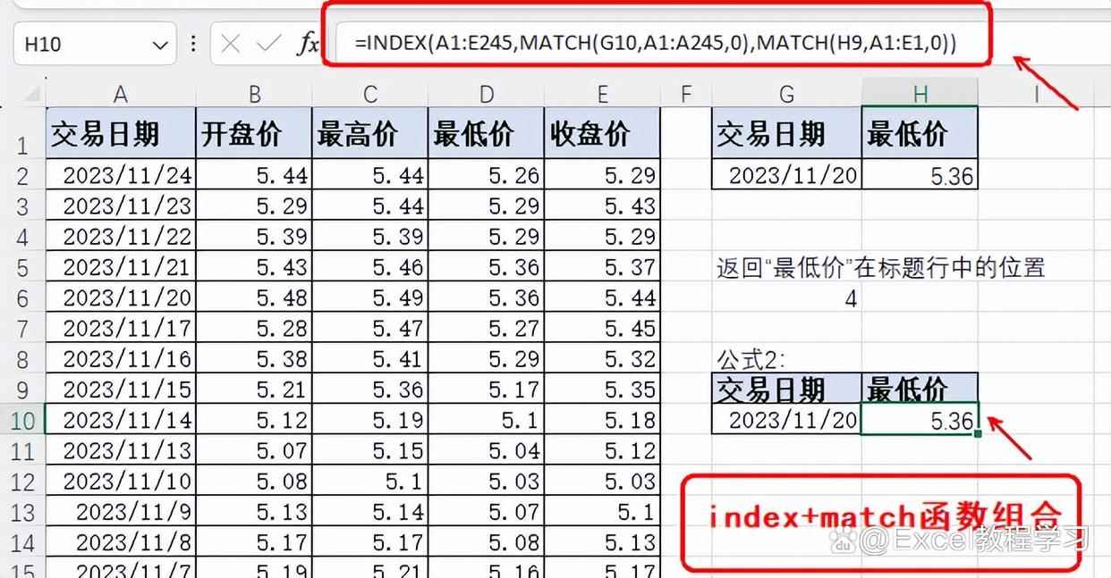 当我们使用index函数来查询特定日期的指定价格,比如开盘价或最低价,则需要执行两次match函数的嵌套。