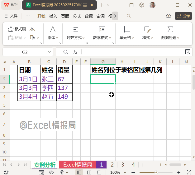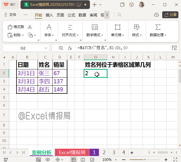 即查找文本值“姓名”在B1:D1单行中的精确匹配位置,很明显位于第2个单元格中,所以位置就是列号2。