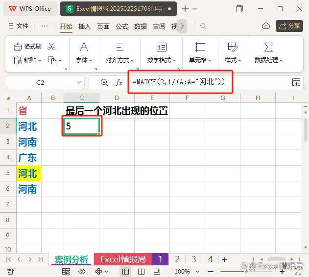 - MATCH(2, ...)会在转换后的数组中查找最后一个1的位置,因为2大于1,且所有1均小于2。所以最后一个1所在的“河北”位置位于A列的第5个单元格。