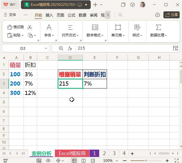 以D3单元格的销量“215”举例,查找值“215”在A2:A4中不存在,则会返回小于等于215的最大值(销量200)所在的行为“2”。