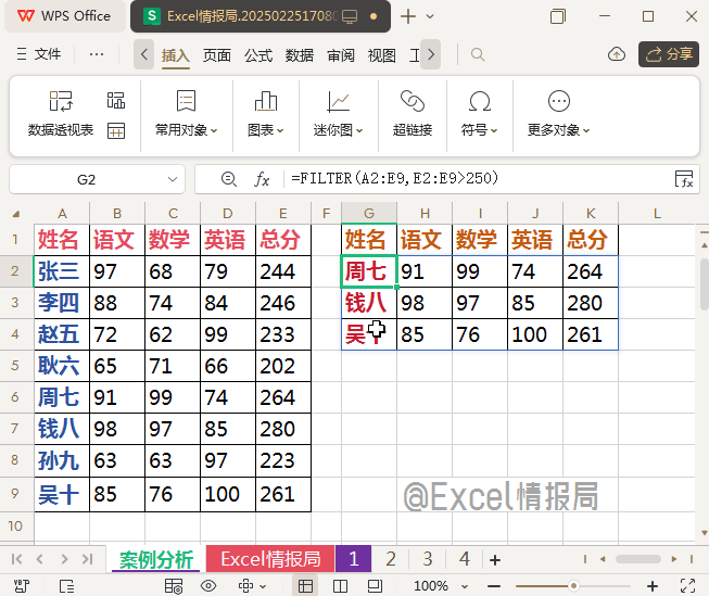 那么我们就得到了总分数大于250分的所有同学成绩的行数据,显示在了G1:K4区域(标题行固定不变)。