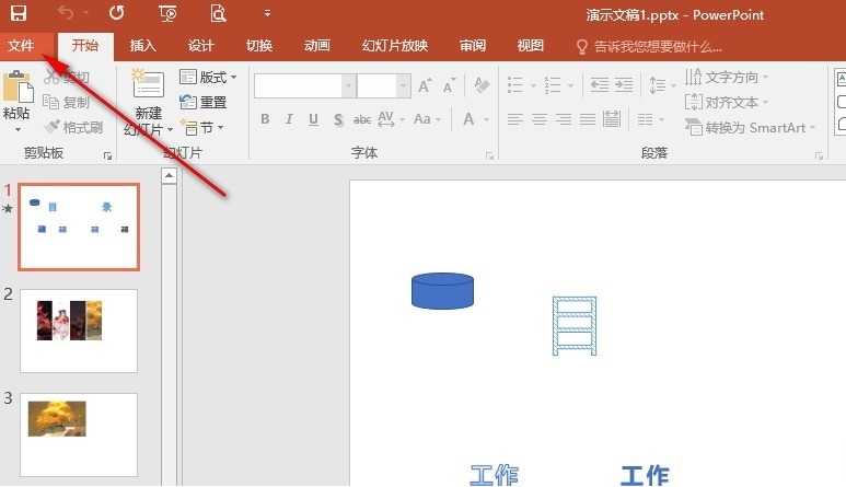 2、第二步,进入演示文稿的编辑页面之后,我们在该页面中点击打开“文件”选项