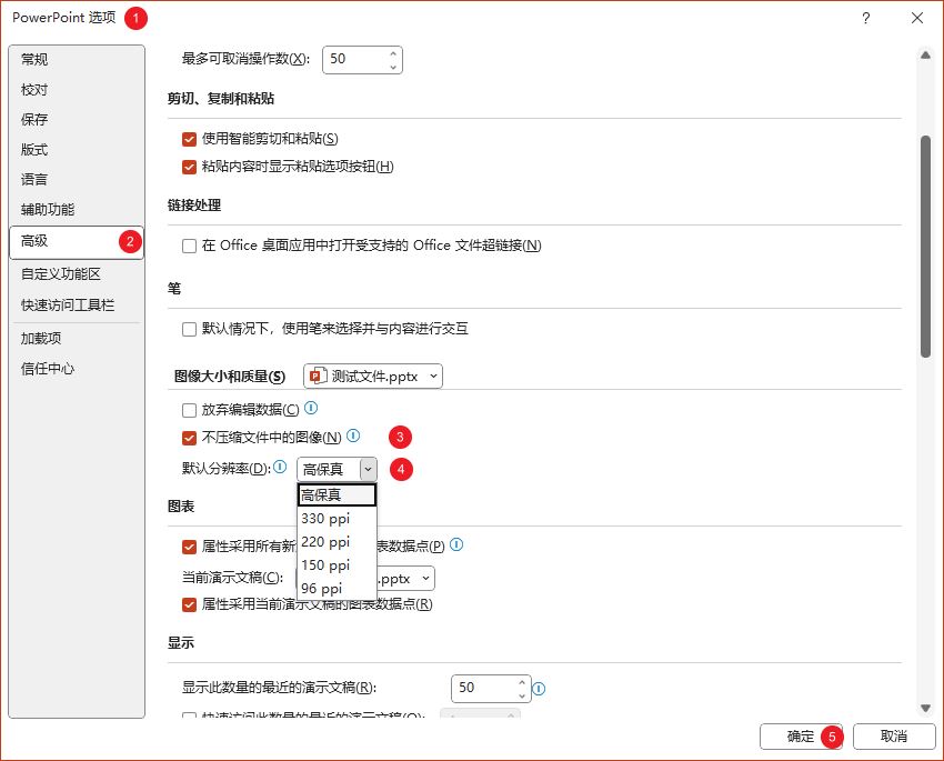 勾选“不压缩文件中的图像”,选择默认分辨率为“高保真”,以免 PPT 在插入图片和保存时,图片被自动压缩,导致 PPT 中的图片本身就不清晰。