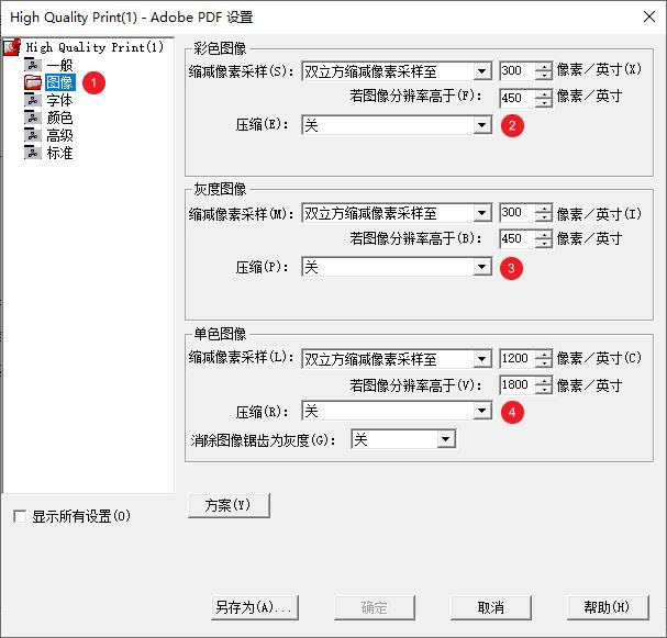 再点击左侧的图像,将右侧所有的压缩均设置为关,前两个采样设置为 300 及以上像素: